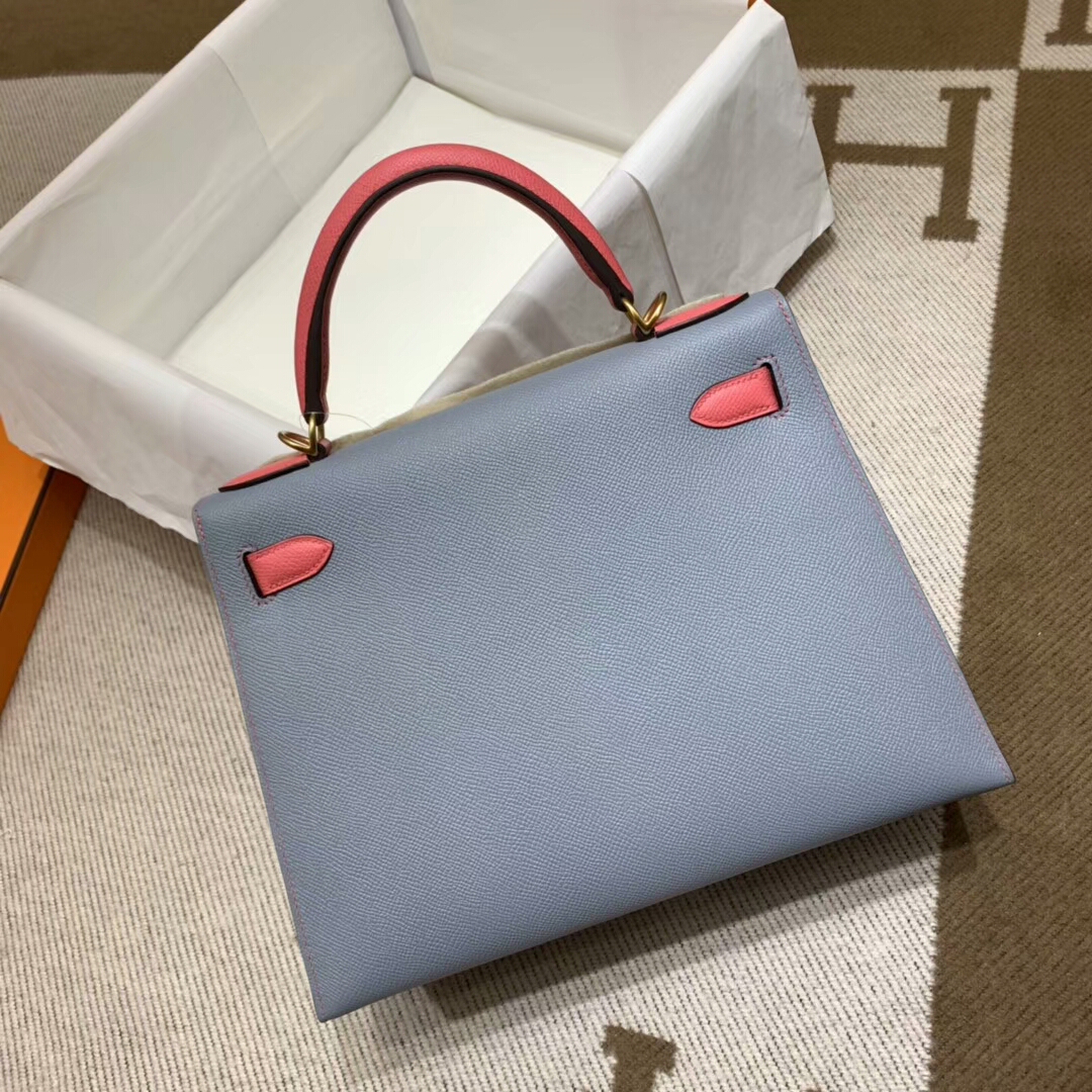 爱马仕凯莉包 Kelly 28cm J7亚麻蓝拼8W唇膏粉 金扣 粉色蜜蜡线手缝 2018年10月23日 0 广州爱玛皮具 Kelly 28CM 爱马仕凯莉包 Kelly 28cm J7亚麻蓝拼8W唇膏粉 金扣 粉色蜜蜡线手缝