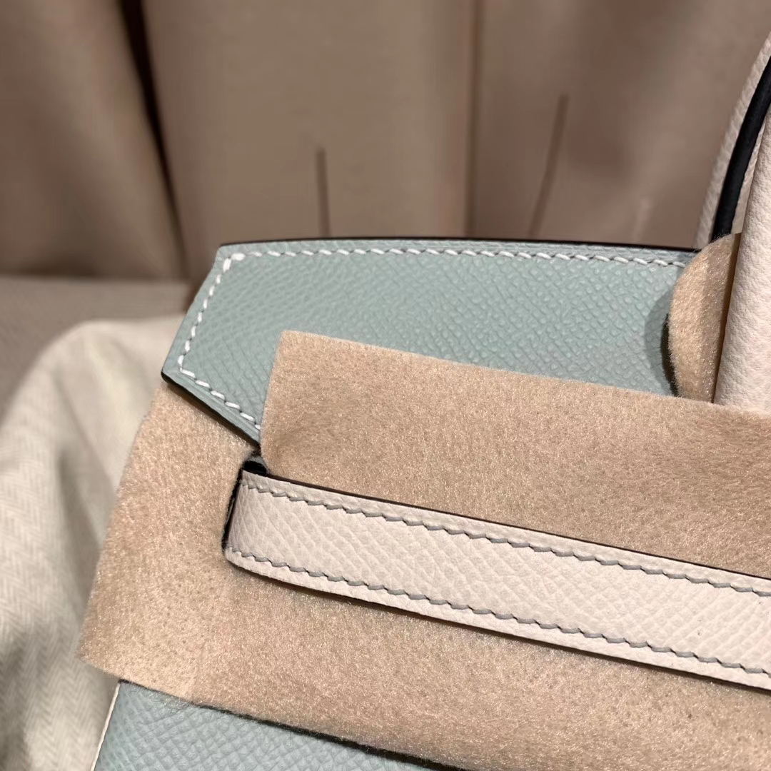 Hermes爱马仕 Birkin 25cm Epsom 8U冰川蓝拼10奶昔白 拉丝金扣 2020年7月20日 0 广州爱玛皮具 Birkin 25CM Epsom Hermes爱马仕 Birkin 25cm Epsom 8U冰川蓝拼10奶昔白 拉丝金扣