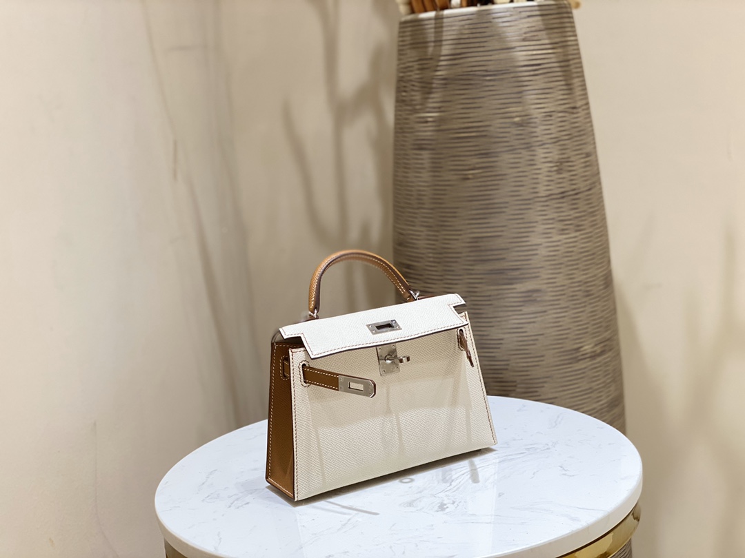 爱马仕包包 Mini Kelly 20cm  10-奶昔白拼金棕 银扣